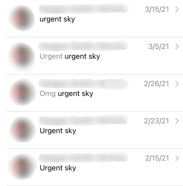 The ritual I’m talking about here is extremely simple: my former partner and I used to tell or text each other “urgent sky” whenever the sky looked particularly beautiful or arresting.